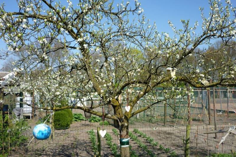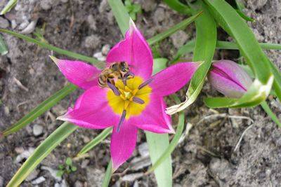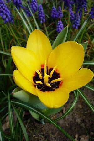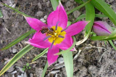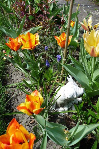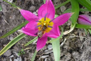 De eerste Tulpen zijn open en de bijen hebben dat ook ontdekt