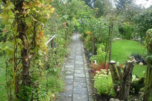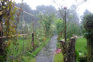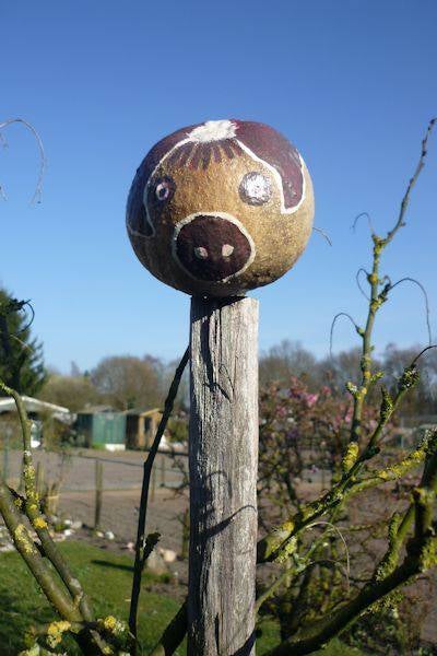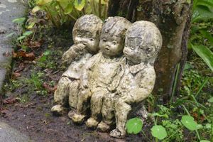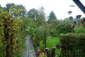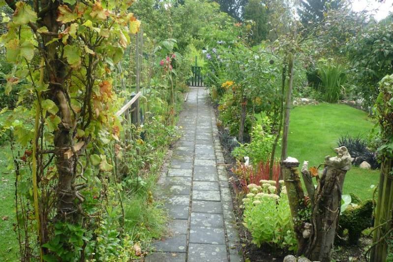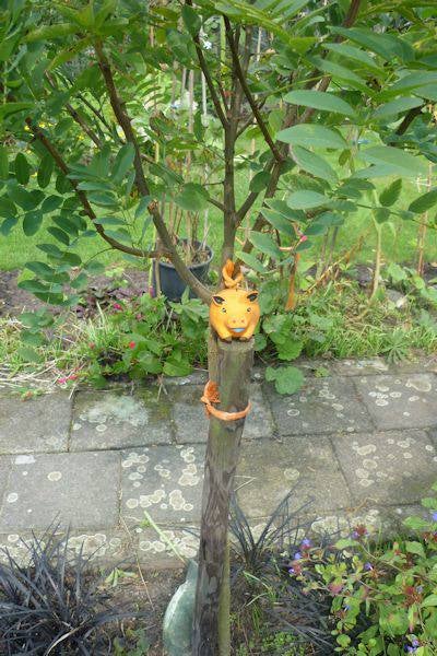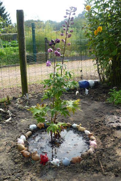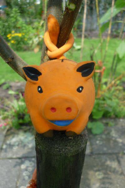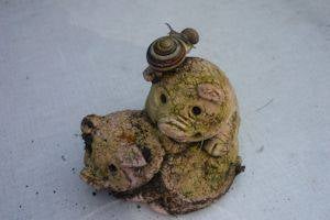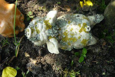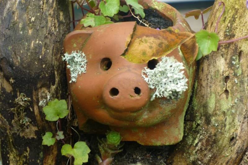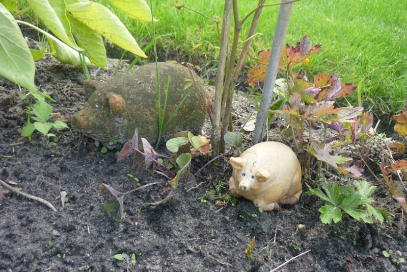 Ook dit terracotta varken is bijna helemaal vergroeid met de tuin