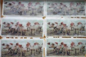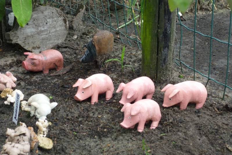 Twee varkens die bijna helemaal vergroeid zijn met de tuin - Schitterend.