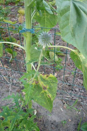 Vrij groot lancetvormig blad, voelt ruw aan, de bloem donkergeel bloemhoofdje tot 12 cm doorsnee met een bol donkerbruin hartje,
