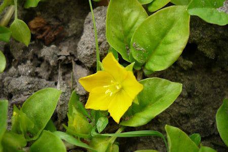 De gele bloemen zijn tot 2,5 centimeter in doorsnede en tellen meestal vijf, soms vier kroonbladen.