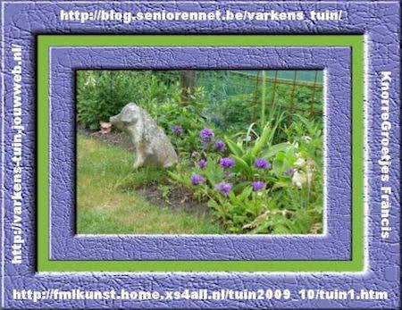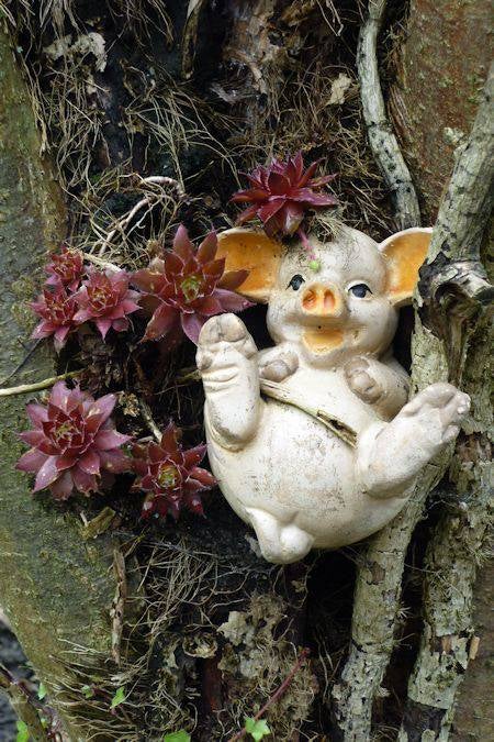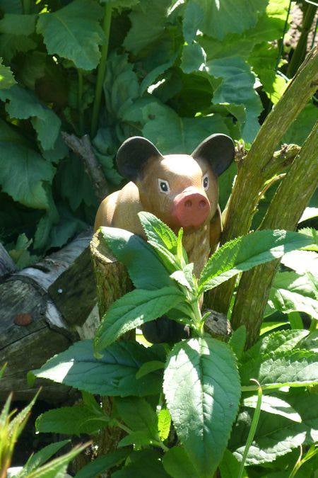 Het houten varken dat ik in de vlinderstruik heb gezet