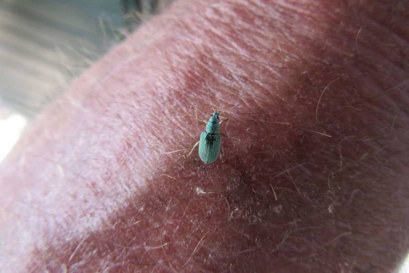 De bladsnuitkever is maar erg kort smaragdgroen,