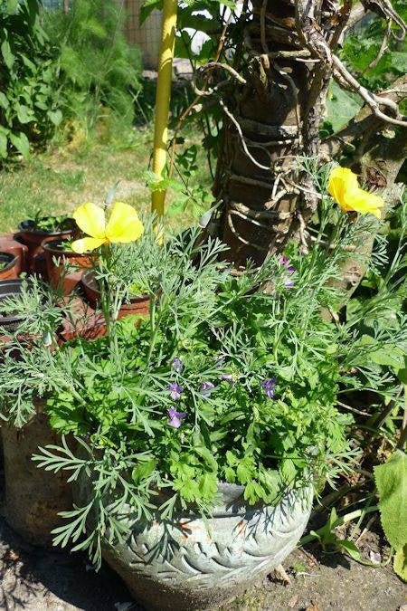 Plomis - Etagebloem - links onder en Geranium (roze) rechts