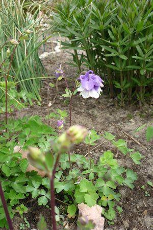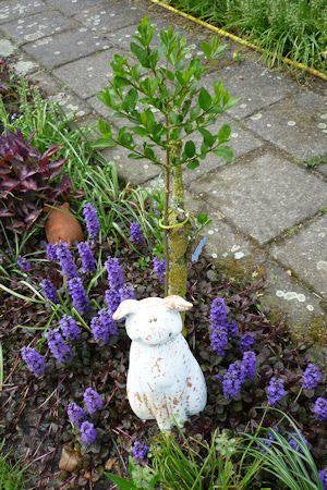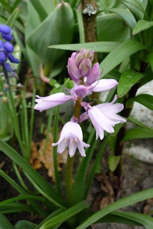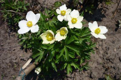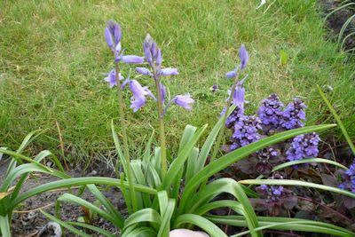 De bloemen doen het nu ook mooi in de tuin, zoals de lage witte Anemoon, de Blauwe klokjes, met op de achtergrond de Ajuga Reptans.